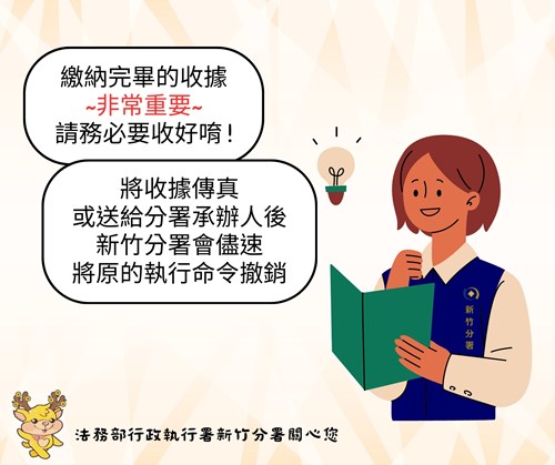 - 請您再次撥打電話詢問新竹分署承辦人員是否收到收據傳真,如有收到,新竹分署會儘速將原先的執行命令撤銷。(此部分須視個案中執行命令的性質而有不同處理喔!)